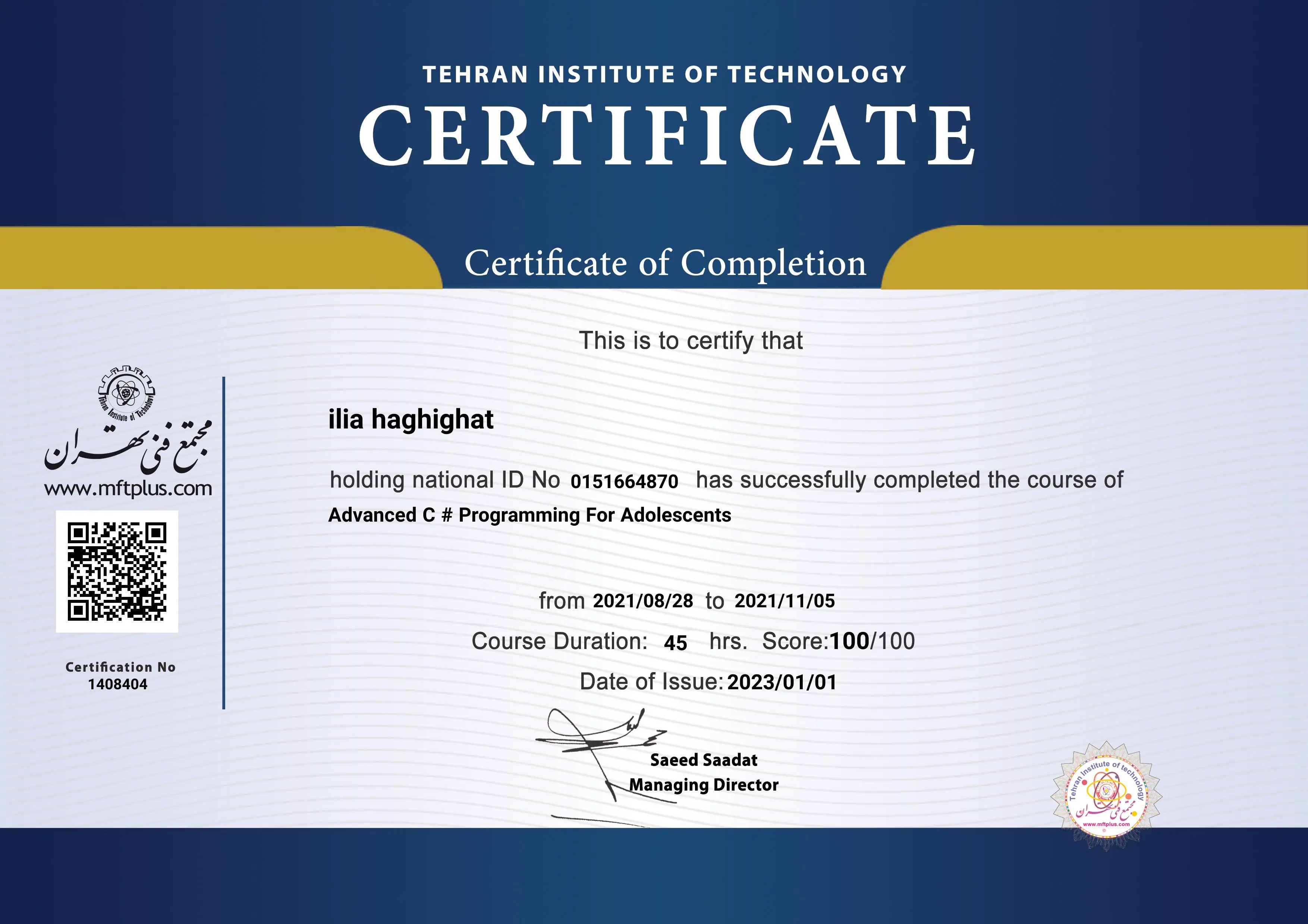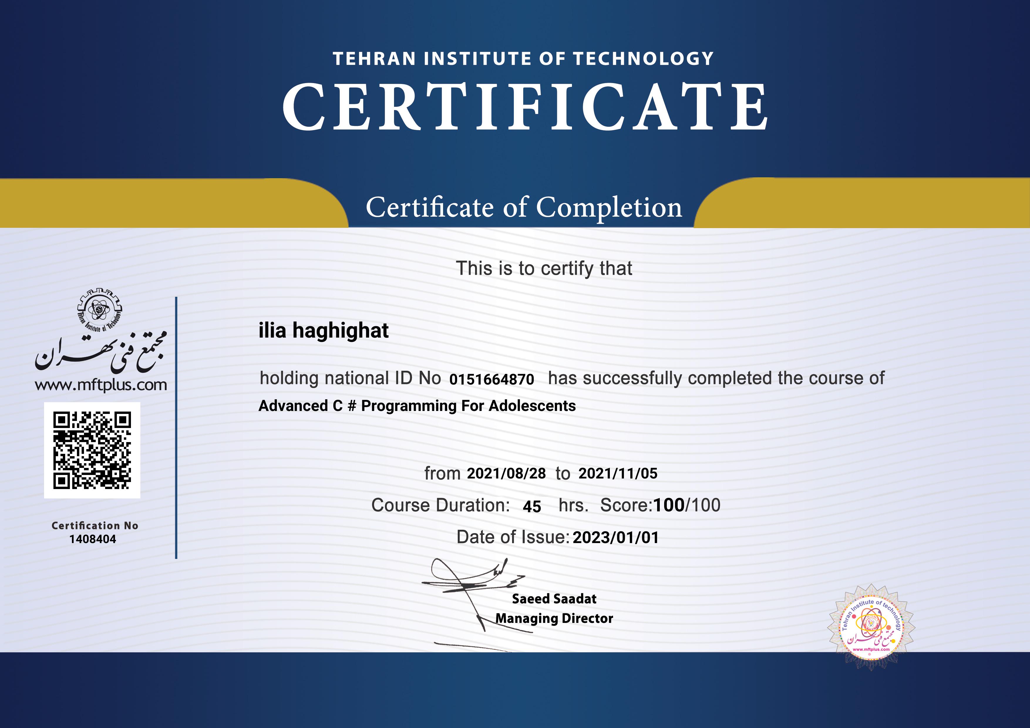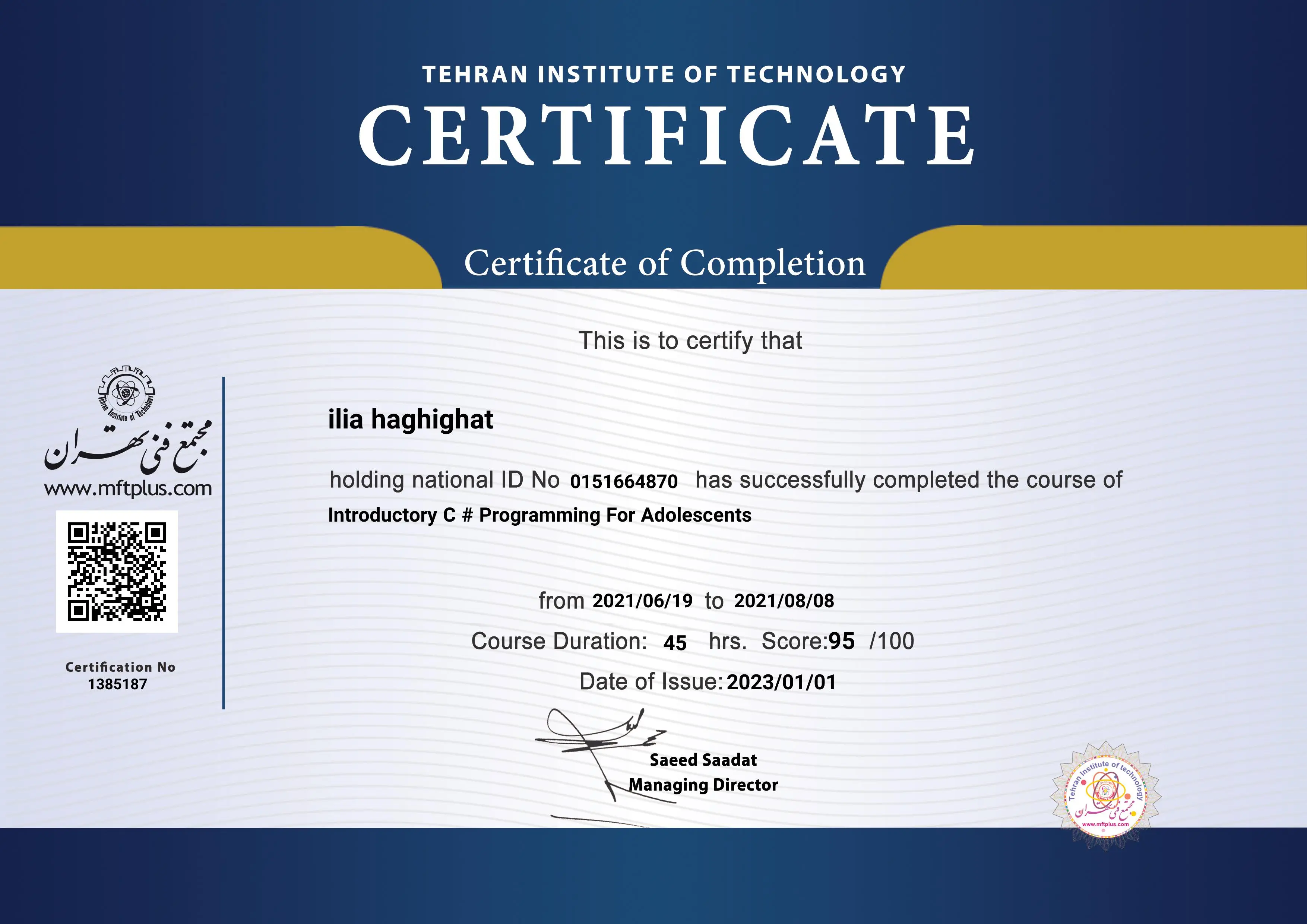 C# introductory programming Degree of Ilia Haghighat from Tehran Technical Complex