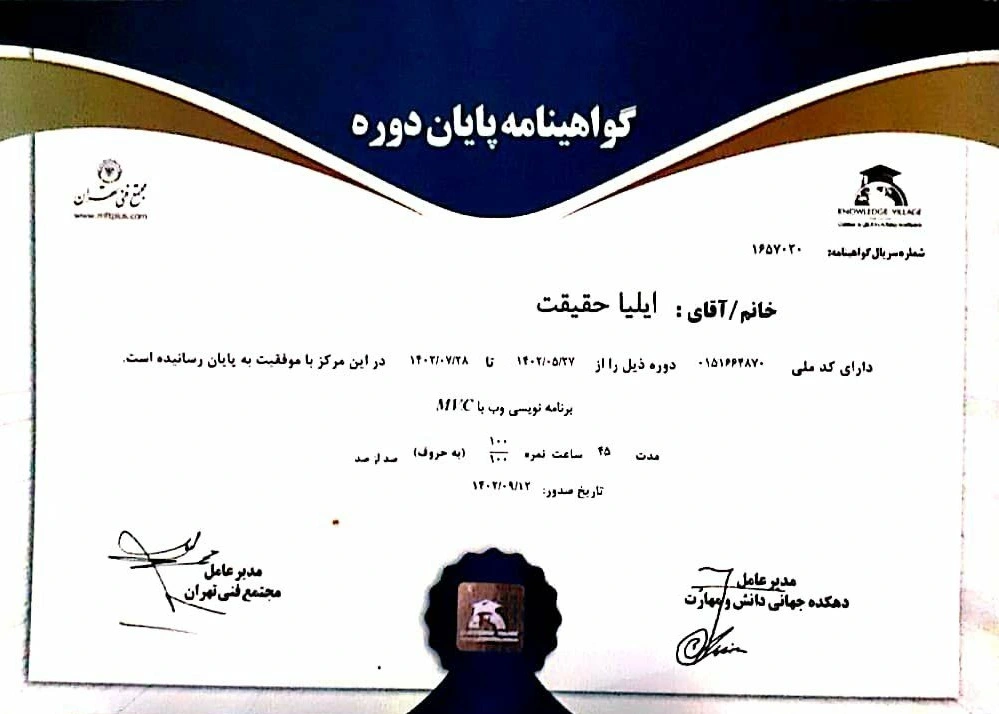 Web programming with Asp.net mvc Degree of Ilia Haghighat from Tehran Technical Complex